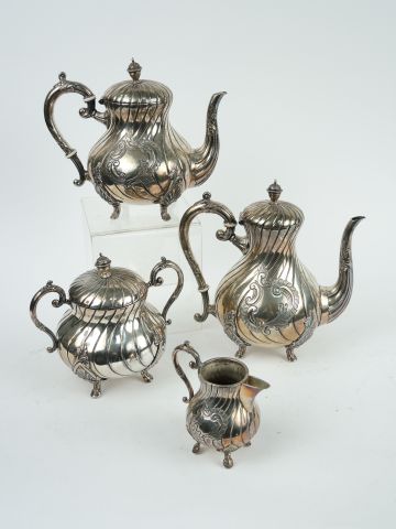 Service à café et à thé quatre pièces de style Louis XV en Sheffield , une jatte à crème à pans coupés en métal argenté, une jatte en métal argenté, un dessous de bouteille en métal argenté, un shaker incomplet en métal argenté