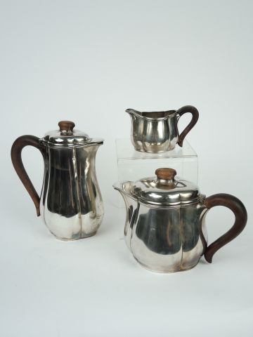 TETARD Frères. Théière, cafetière et pot à lait Art Déco, à décor de godrons stylisés, prises et anses en bois. Poids tel : 1500g