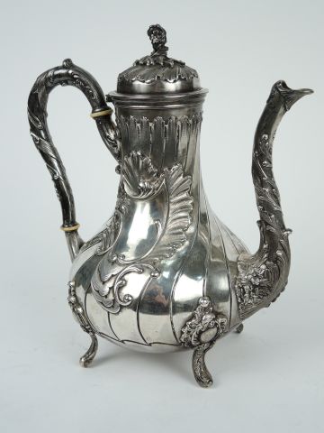 Théière de style rocaille en argent, poinçon Minerve, à décor de godrons, de feuillage et d'un cartouche feuillagé. Poids : 750g
