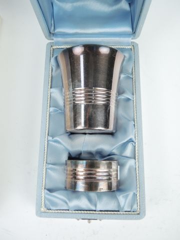 Timbale et rond de serviette en métal argenté. Dans son coffret