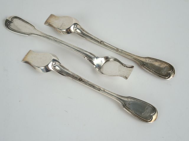 Trois cuillères à sel en argent, poinçon au premier coq, modèle à filet, spatules gravées d'écussons. Poids : 43 g