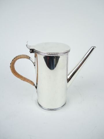 Verseuse égoïste en métal argenté anglais, anse recouverte d'osier.