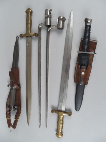 12-Lot pour collectionneur débutant ou pour marchand sur vide grenier, on y trouve : Une baïonnette de Mauser suédois modèle 1896 dans son fourreau avec porte fourreau, Deux glaives Français 1833 sans fourreaux, de proportions légèrement différentes, Un baïonnette moderne Suisse de SIG 57 dans son fourreau, et deux baïonnettes à douille Françaises. (2).