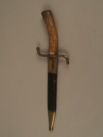 14-Forte dague de vénerie fin XIXème, fusée bois de cerf, garde fer contrariée, lame à 4 pans symétriques, fourreau cuir à garnitures laiton. (1-)