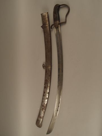 17- Fort sabre de cavalerie Allemand a la Blücher branche de garde unique monture fer lame courbe a une gorge fourreau tôle d’acier a deux bracelets. (1-).