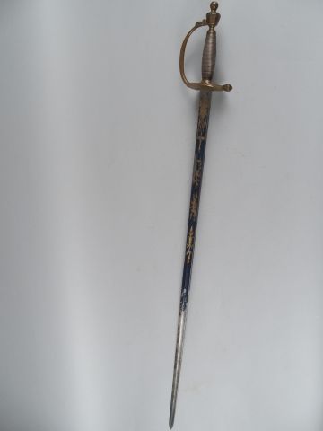 20- Epée a clavier étrangère monture en bronze pommeau en urne bouton de rivure proéminant plateau rabattable vers l’avant fusée filigranée de fils d’argent plat. Lame à dos plat gouttière bleuie et dorée au deux tiers. Pas de fourreau. (1-).