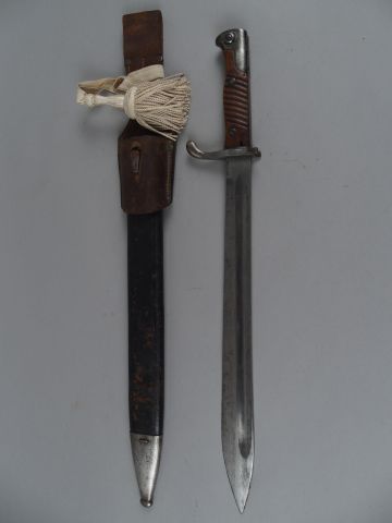 22- Baïonnette Allemande modèle 98/05 modèle sans pare flamme à oreilles hautes fabrication « Simson Co Suhl » réceptionnée par la Prusse en 1915, dans son fourreau cuir à garnitures fer, porte fourreau en cuir fauve. Dragonne de compagnie entièrement blanche. (1-).
