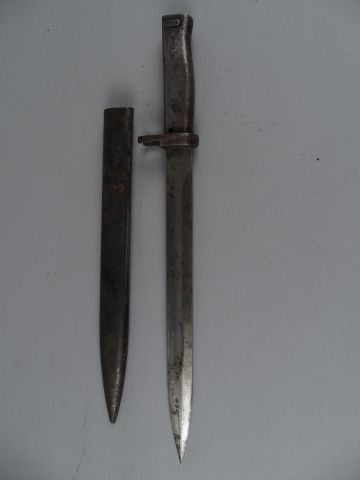 25- Baïonnette Allemande première guerre, modèle Ersatz tout fer, trou rond dans la poignée, avec son fourreau. (1-).