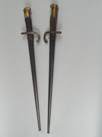 7-Baïonnette réglementaire française de fusil Gras modèle infanterie fabrication « Mars 77 Châtellerault ». Dans un fourreau pas au numéro. On y joint une baïonnette réglementaire française de fusil Gras modèle infanterie fabrication Mai 1876 St Etienne. Dans un fourreau pas au numéro, lame épointée. (1-)
