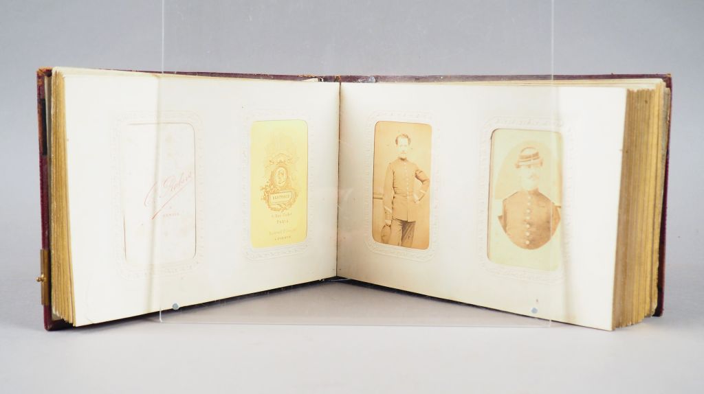 Album relié cuir rouge contenant 21 photos représentant une famille de cuirassiers en grande et petite tenue. On y trouve notamment un dragon en grande tenue. Album contemporain de la guerre Franco-Prussienne de 1870. Etat 1
