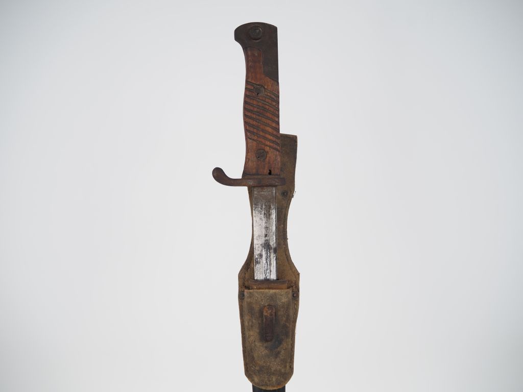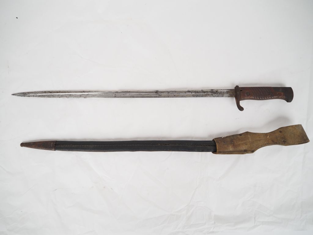 ALLEMAGNE Baïonnette modèle 1898. Poignée à plaquettes de bois. Monture en fer, croisière avec matricule du 182e régiment. Lame à gouttière de SIMSON datée « 05 ». Fourreau en cuir à deux garnitures en fer avec gousset. Longueur SF : 65 cm. E.M. (Oxydations à nettoyer).