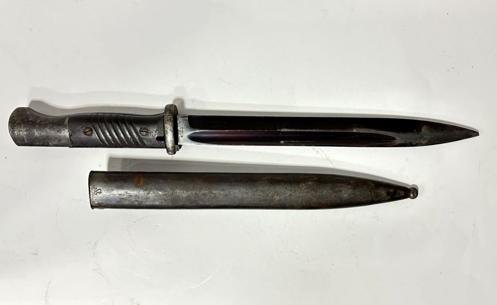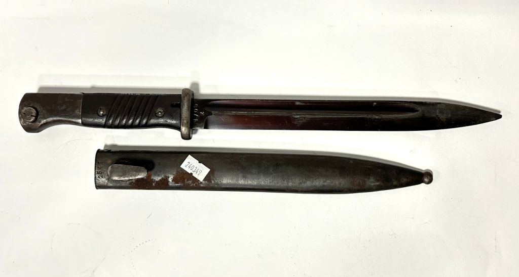 ALLEMAGNE Une baïonnette 1884-98. Plaquettes synthétiques. Finition bronzée (oxydations). Lame bronzée marquée 41 ASW. Fourreau COF 43. Longueur : 38,4 cm. A.B.E.