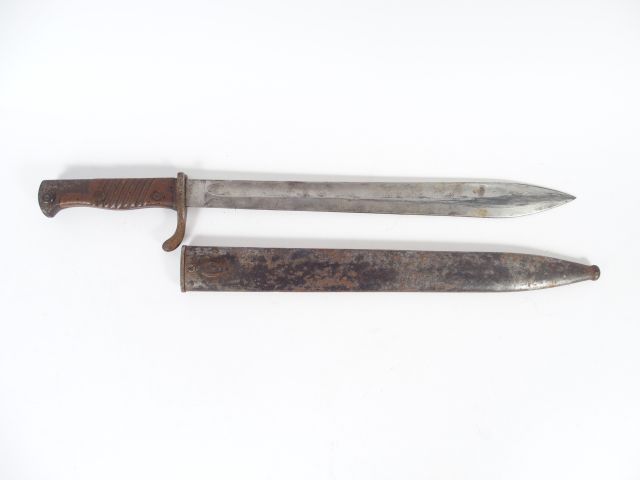 Baïonnette Allemande modèle 98/05 modèle sans pare flamme à oreilles basses fabrication « Simson Co Suhl » réceptionnée par la Prusse en 1915, dans son fourreau acier à nettoyer. 1-