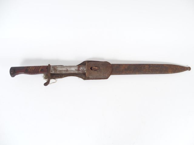 Baïonnette Allemande modèle 98/05 modèle sans pare flamme à oreilles basses fabrication « Simson Co Suhl » réceptionnée par la Prusse en 1915, dans son fourreau acier à nettoyer, porte fourreau en cuir fauve. 1-.