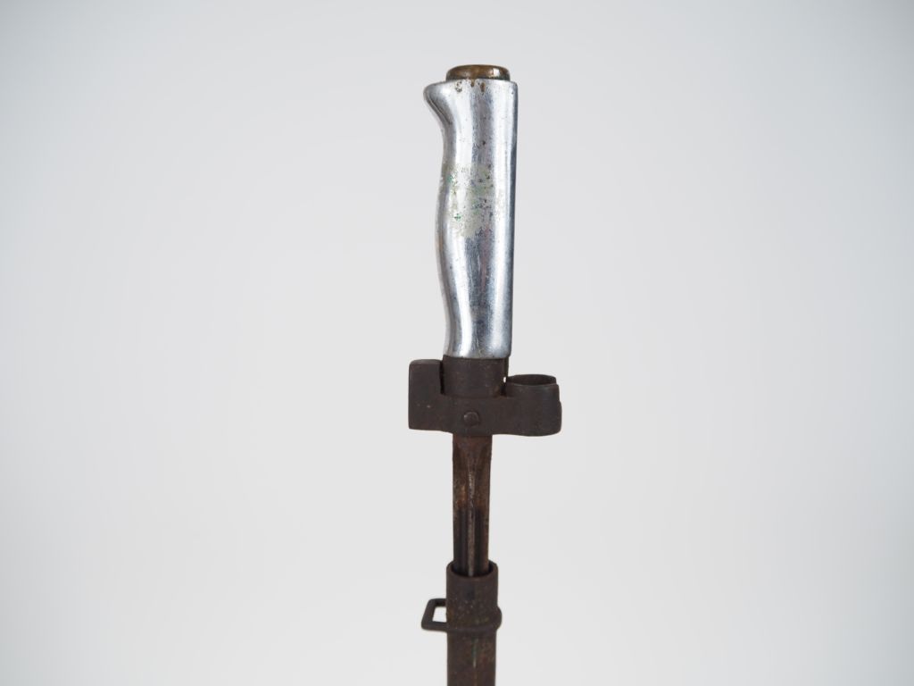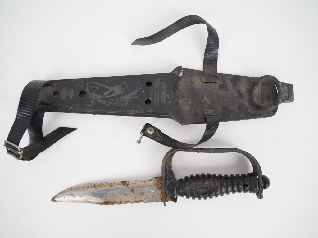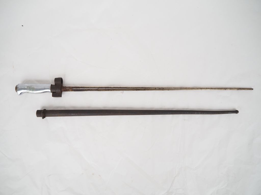 Baïonnette Lebel 1886 modifié 15. Poignée argentée. Croisière en fer. Lame cruciforme. Fourreau en tôle de fer Lg : 63 cm. E.M. (Oxydations, épointée) On y joint un poignard de plongeur « CRESSI SUB » (poignée accidentée). E.M.
