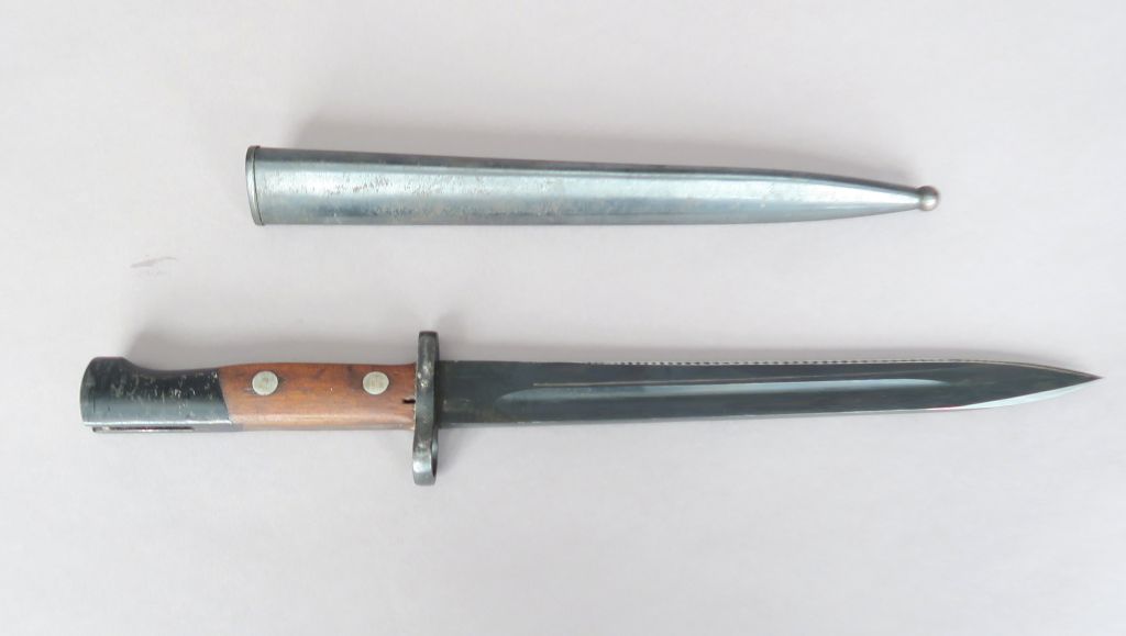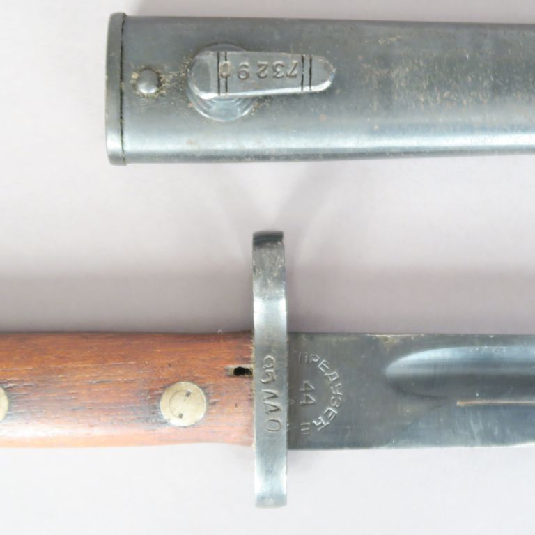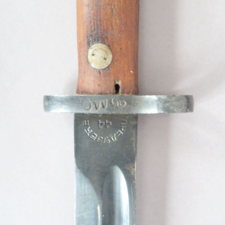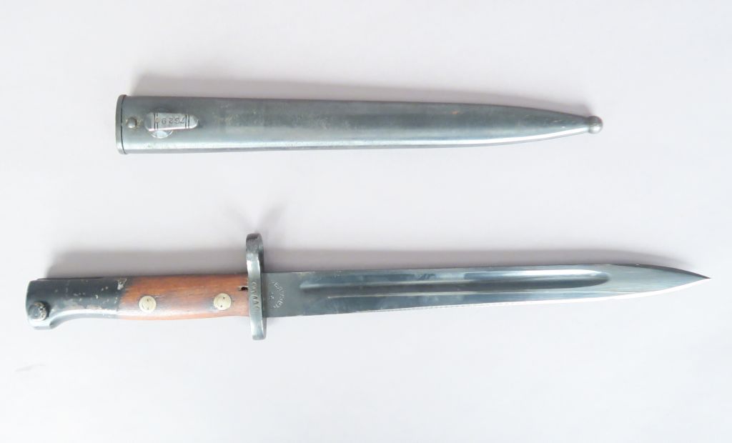 Baïonnette Mauser pour l’export, probablement Hongroise. Lame marquée 44. Lame et fourreau bronzés. A.B.E.