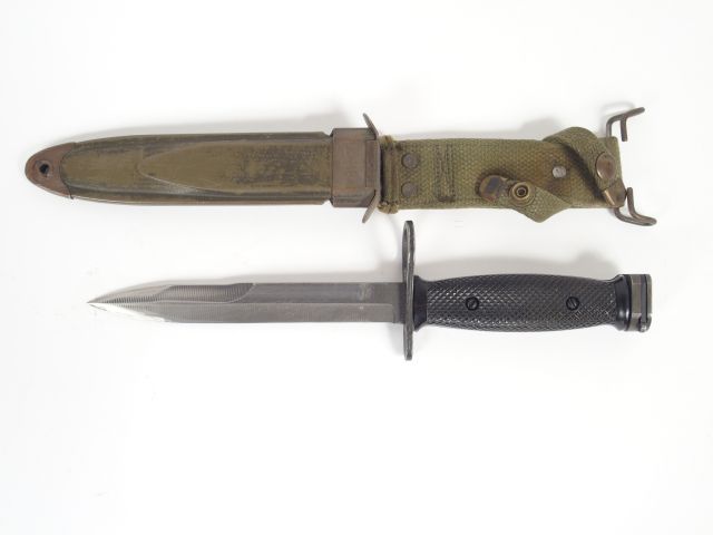 Baïonnette U.S. pour carabine USM1 type U.S.M7. Dans son fourreau type USM8 A1 lame phosphatée, plaquettes plastique noir quadrillé .1-