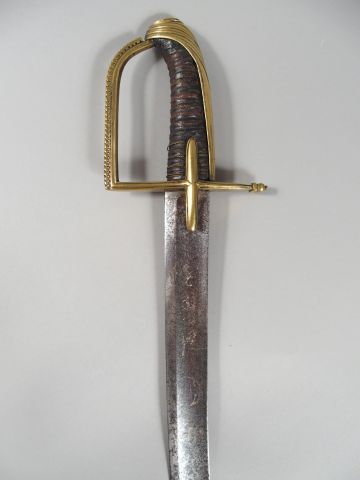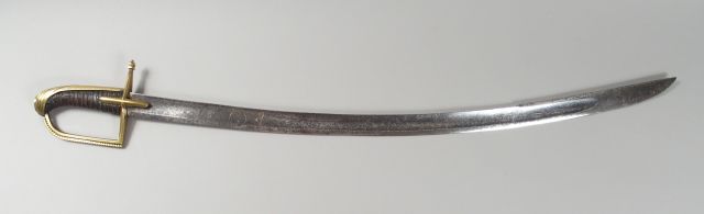 Beau sabre d’officier de cavalerie légère fin de l’ancien régime. Monture en bronze coulé ciselé, calotte à longue queue drapée au niveau du pommeau, arc de jointure unique surmonté d’une crête décorée d’une frise de perles aux embases percées à jour. Oreillons en navette allongée bordée d’un trait incisé. Fusée bois gainée de cuir et filigranée. Belle lame courbe de 820 mm de long à gorge à décor de Turqueries et astres gravés au trait (croisant de lune, Mamamouchi, trophées d’armes.) Pointe à dard dorsal. Pas de fourreau. (1-)