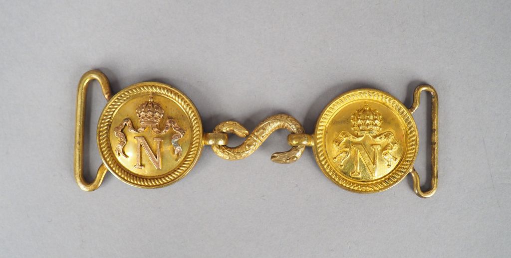 Belle boucle agrafe de ceinturon porte épée d’officier supérieur Second Empire. Deux boucles rondes en laiton doré « N » couronné en relief crochet serpentiforme. (Grenadier où voltigeur) Etat 1