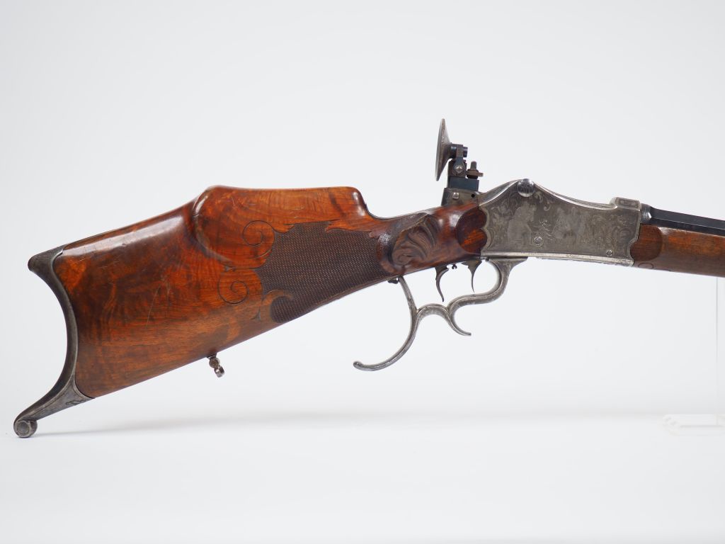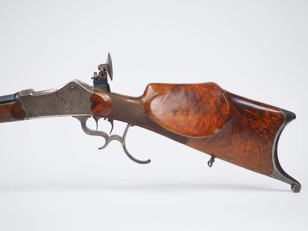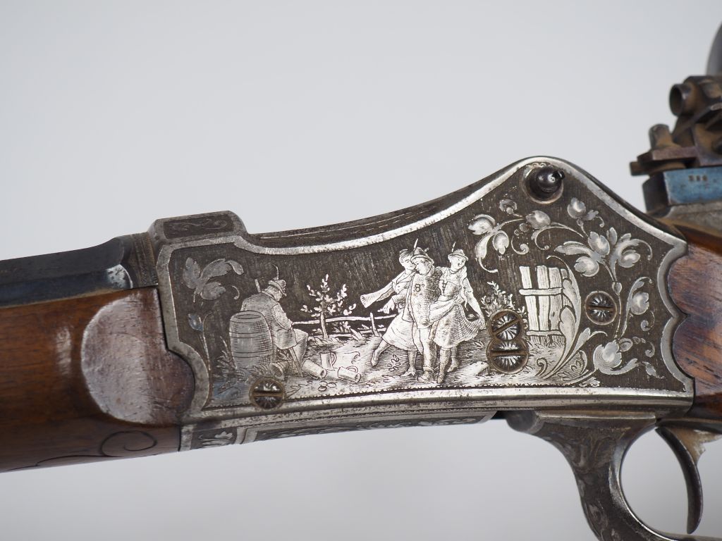 Belle carabine de tir allemande à bloc tombant en calibre 8mm (soufre de chambre pour confirmer le calibre à faire) canon marqué « 7,6 » sous la monture. Signature sur le plat du canon d’un armurier à Freiburg in Bresgau. Canon octogonal bronzé et strié antireflets sur le plat supérieur. Hausse réglable sur long rail et guidon réglable et dérivable. Boite de culasse et garnie traitée vieil argent et richement gravée de scènes de retour de chasse et de libations. Pontet à repose doigt, plaque de couche à crocs, double détentes, superbe dioptre réglable. Belle monture en noyer blond quadrillée à la poignée à forte joue à gauche et repose pouce à droite. Mécanisme fonctionnel, très belle fabrication dans un état de fraicheur remarquable. Le canon porte le marquage indiquant la nuance d’acier employé à sa construction « PRIMA Flussthal ». Rayures parfaites. Arme de catégorie « D » (Etat 1)