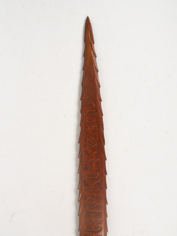 Belle épée cérémonielle monobloc en bois dur sculpté finement de figures totémiques sur la fusée, lame dentelée et sculptées (de motif rappelant de manière assez fantaisiste l'écriture Rongorongo de l'ile de Paques). Poignée recollée, provenance probable iles du pacifique d'une culture ne connaissant pas le travail du métal. (Etat 1)
