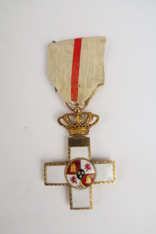 Belle et fine Croix en or et émail blanc du mérite militaire Espagnol fin XIXéme, division blanche (distinction hors service armé), absolument intacte, centre armoriés au recto, centre rouge (lettres entrelacées au verso) avec son ruban blanc à fine raie rouge. Décoration instituée le 3 Aout 1864. Etat 1+.