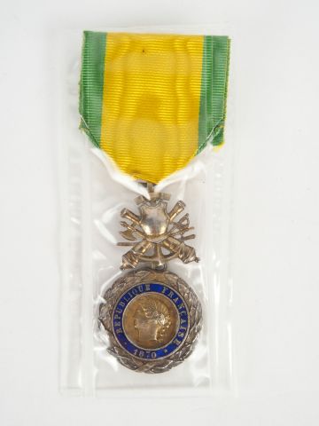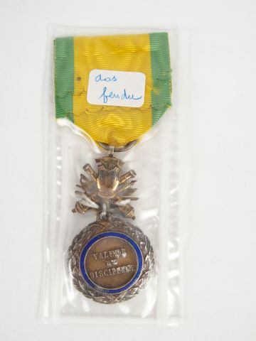 Belle et rare médaille militaire troisième république, variante à trophée biface articulé, avec cuirasse au dos fendu. 1
