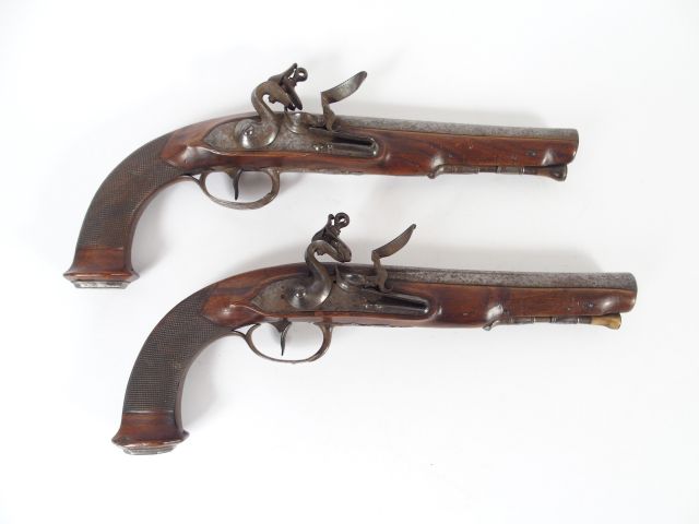 Belle paire de pistolets à silex époque empire de fabrication bourgeoise. Armes montées fer, calotte de crosse octogonale à décor de trophées d’arme, contre platine sous forme de rosettes indépendantes, discrètement reliées par un décor de fil d’argent incrusté dans le bois. Belle monture en noyer blond quadrillé, poignée très arquées typique de la période 1er empire. Belles platines à corps rond, bassinets rond fer, venus de forge, ressort de batterie vissés de l’intérieur, chien col de cygne, le maitre ressort à un liant extraordinaire signant sans équivoque possible une fabrication soignée. Canons rond à arrête sommitale, Baguettes ébène, embout corne. Longueur 345mm. Mécanismes parfaitement fonctionnels. 1.