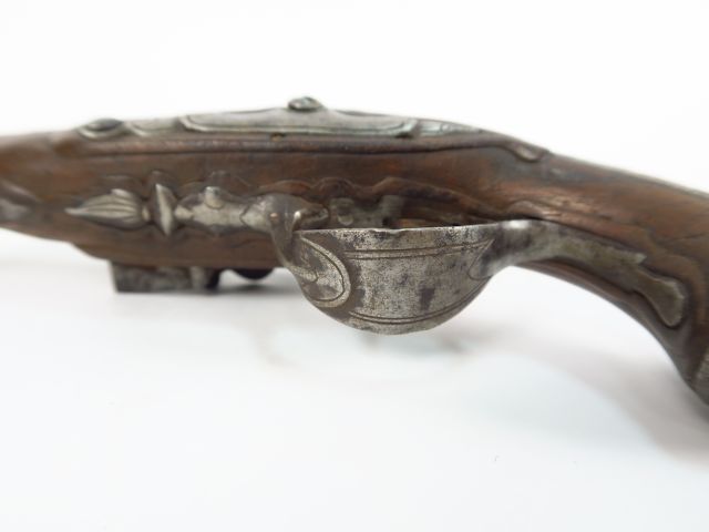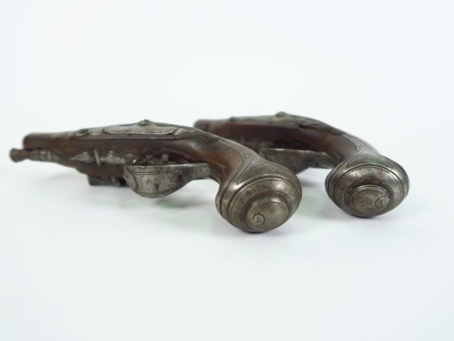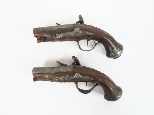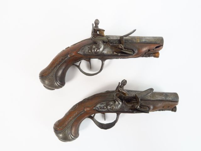 Belle paire de pistolets de gousset à silex montés fer époque Louis XV. Monture noyer, incrustation de fils d’argent, calottes à longues queues, platines à corps rond, chien col de cygne, bassinet fer ronds venus de forge, vis de batteries vissée de l’intérieur. Mécanismes à revoir, canons ronds moulurés avec reste de dorures. Armes de catégorie « D ». (2)