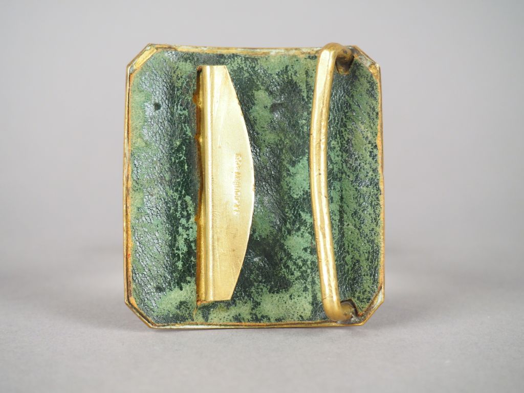 Belle plaque de ceinturon de cent-gardes, plateau rectangulaire à pans coupés de 657mm x 720 mm , au centre on trouve les grandes armes de la maison de l’empereur rapportées en bronze finement ciselé. Le dos est habillé d’une feuille de maroquin vert, crochet portant le nom du fabricant (J.L. Goufry cie). Large pontet en laiton. Etat 1