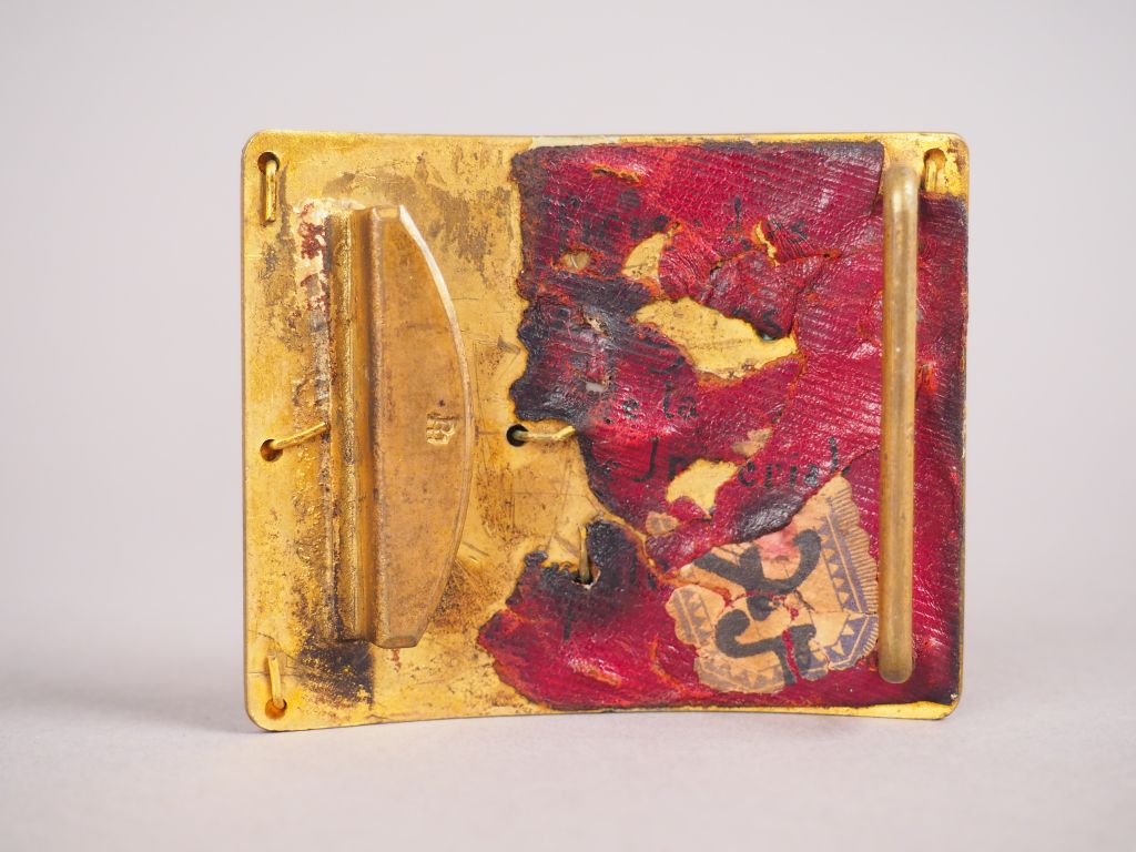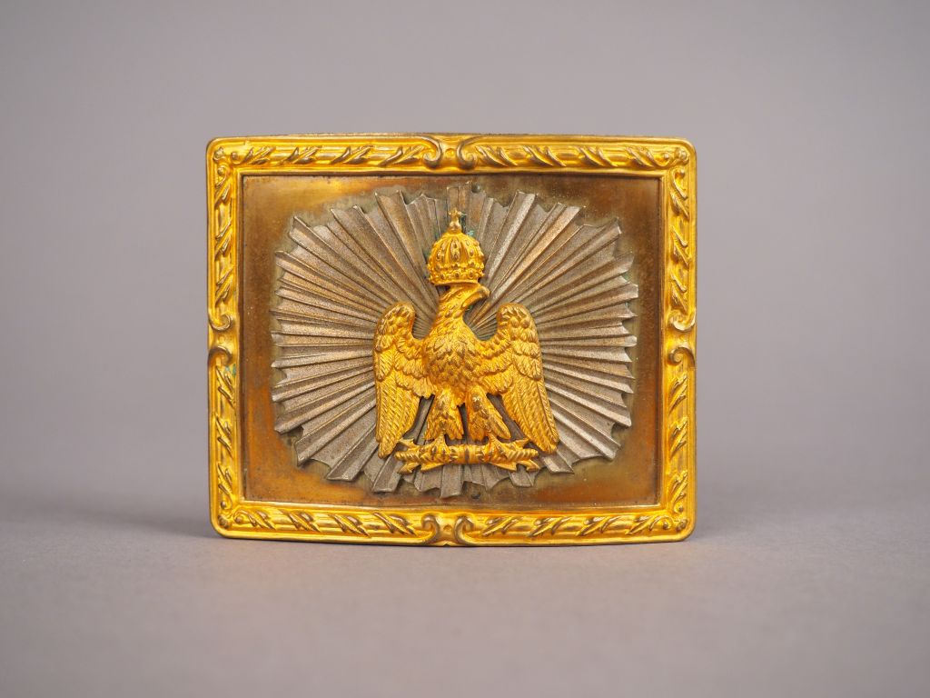 Belle Plaque de ceinturon d’officier de cuirassier de la Garde impériale Second Empire, plateau rectangulaire (61mm x 80mm) en cuivre rouge, un cartouche floral en relief en laiton doré détermine le contour du plateau, au centre un aigle couronné sur foudres en laiton doré et agrafé sur un soleil rayonnant en relief (traces d’argenture). Arrière avec crochet plat et pontet (sans ardillons). Etat 1-