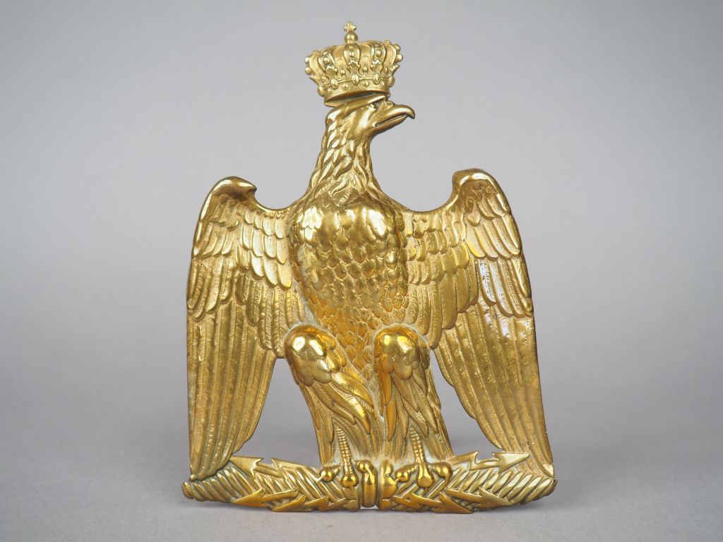 Belle plaque de sabretache de hussard modèle 1854 en laiton embouti, aigle couronné (couronne rapportée), cinq pontet pour la fixation sur la patelette de la sabretache (175 mm X 125 mm). Etat 1