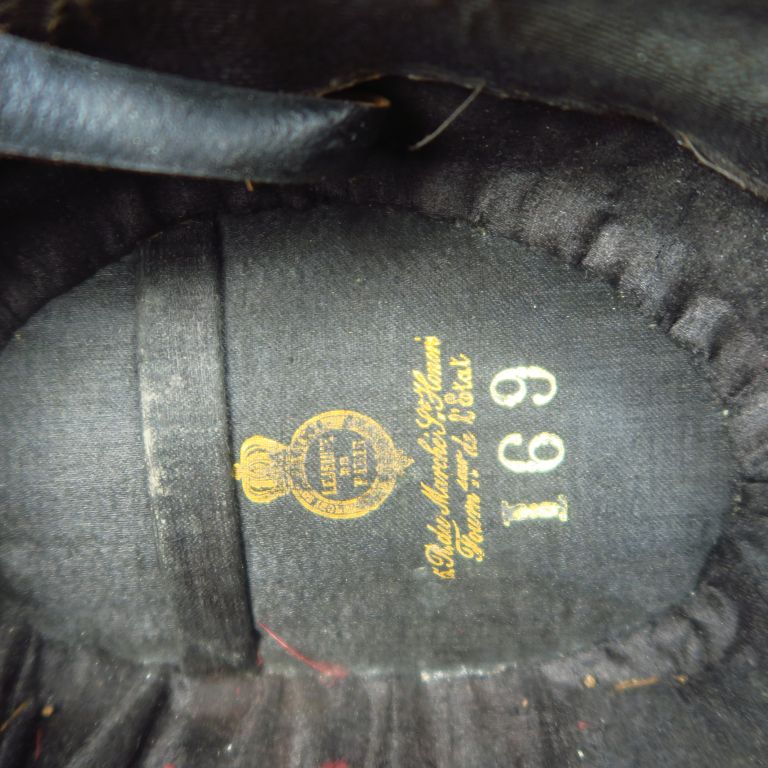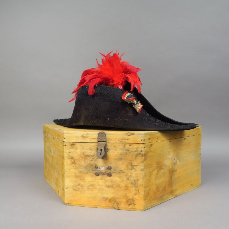 Bicorne en taupé noir, galon noir à décor de frise florale, manque ganse, cocarde en tissu tricolore plumet rouge en plumes de cou de coq, intérieur soie noire, signautre fabriquant doré au petit fer, dans sa boite de transport en bois naturel. Etat 1.