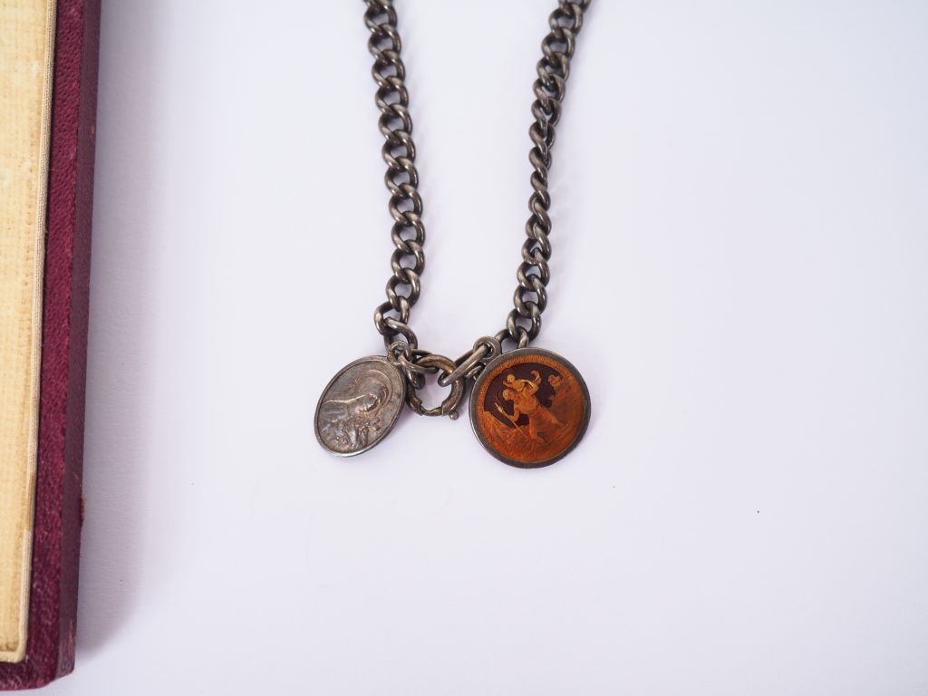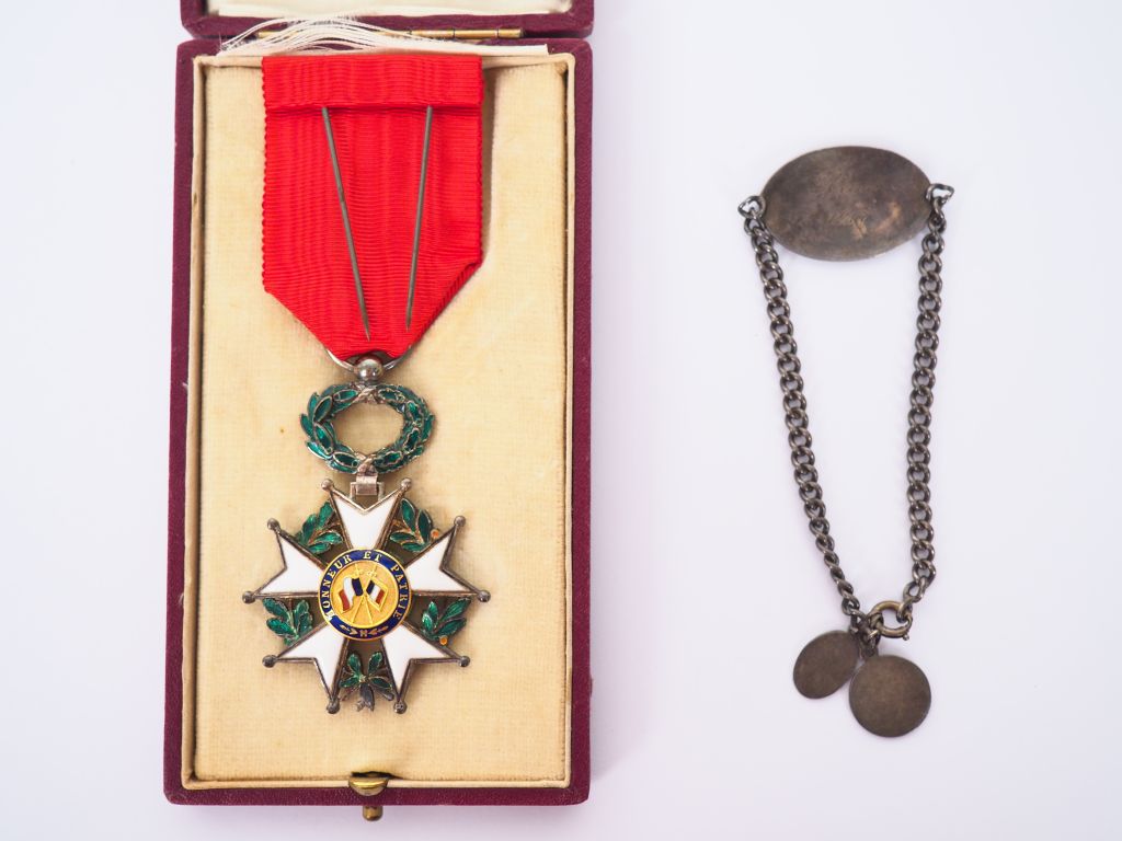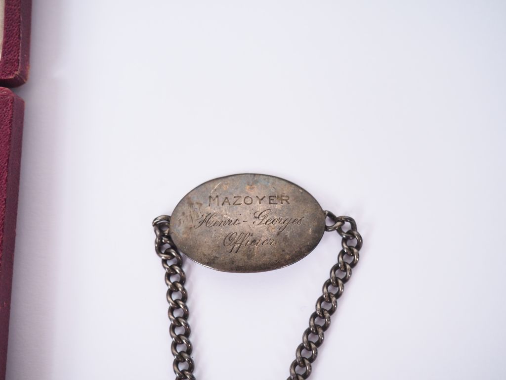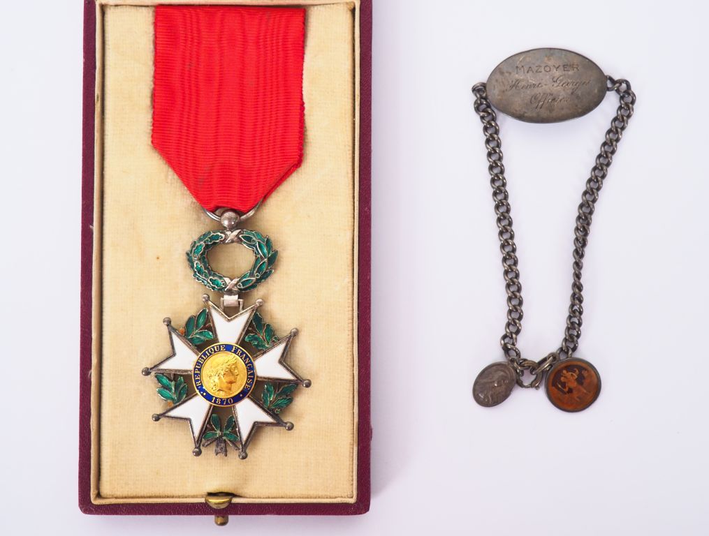 Boite en carton rouge contenant une belle étoile de chevalier de la légion d’honneur intacte ave son ruban et un bracelet en métal argenté faisant office de plaque d’identité militaire « Mazoyer Henry Georges officier » avec deux breloques religieuse porte bonheur. Etat 1.