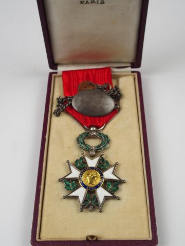 Boite en carton rouge contenant une belle étoile de chevalier de la légion d’honneur intacte ave son ruban et un bracelet en métal argenté faisant office de plaque d’identité militaire « Mazoyer Henry Georges officier » avec deux breloques religieuse porte bonheur.1