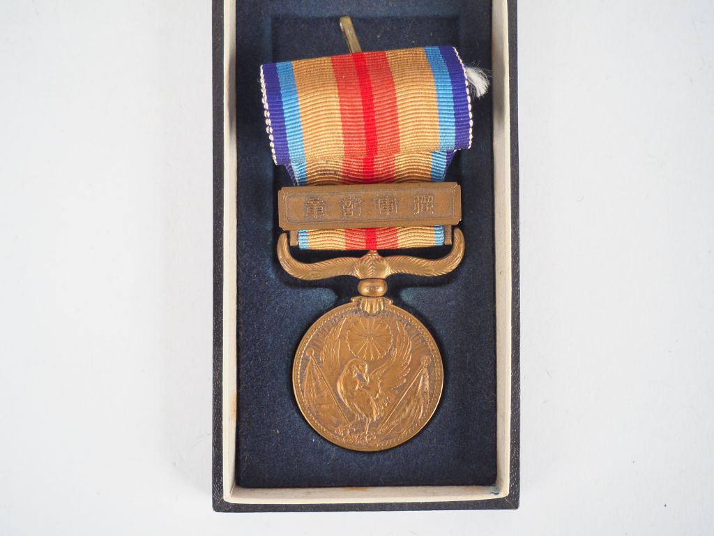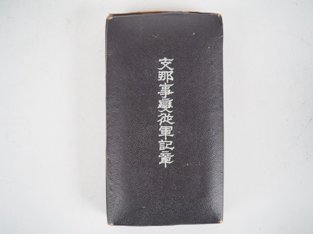Boite en cartonnage noir idéogrammes argentés sur le couvercle contenant une médaille japonaise dite de la Guerre de l'Incident de Chine (7 juillet 1937 Guerre sino-japonaise. Médaille créée par Edit Impérial du 27 juillet 1939 et attribuée jusqu'en 1945). Module bronze rond biface avec son ruban arc-en-ciel et sa barrette. (Etat 1-)