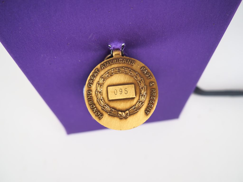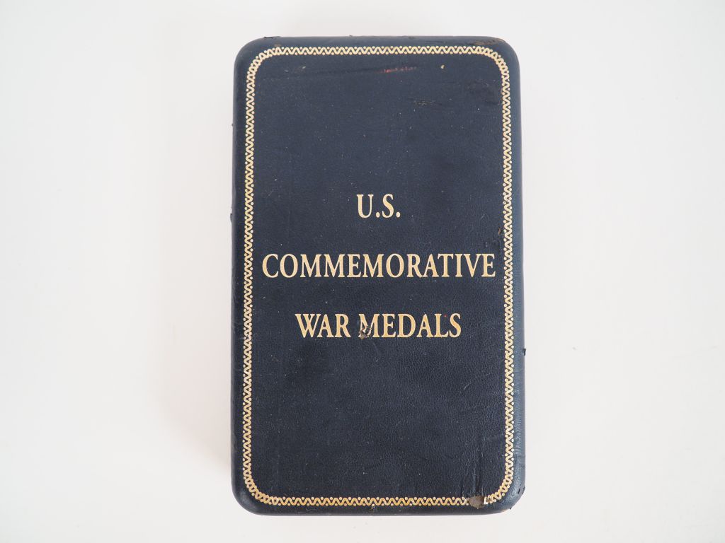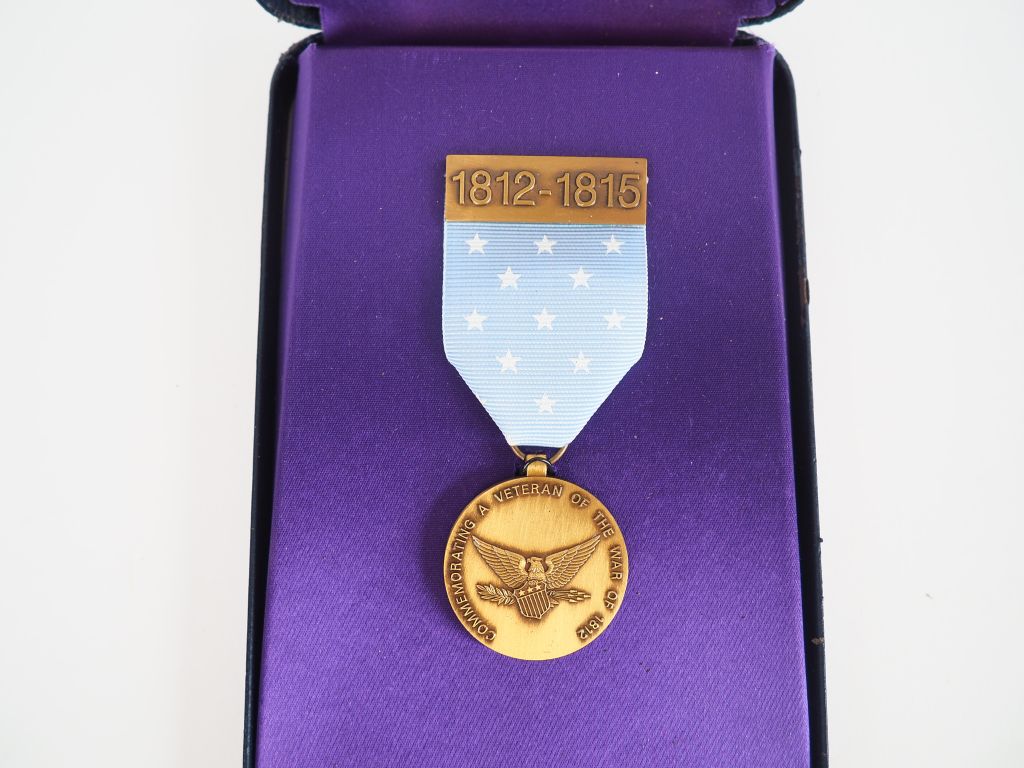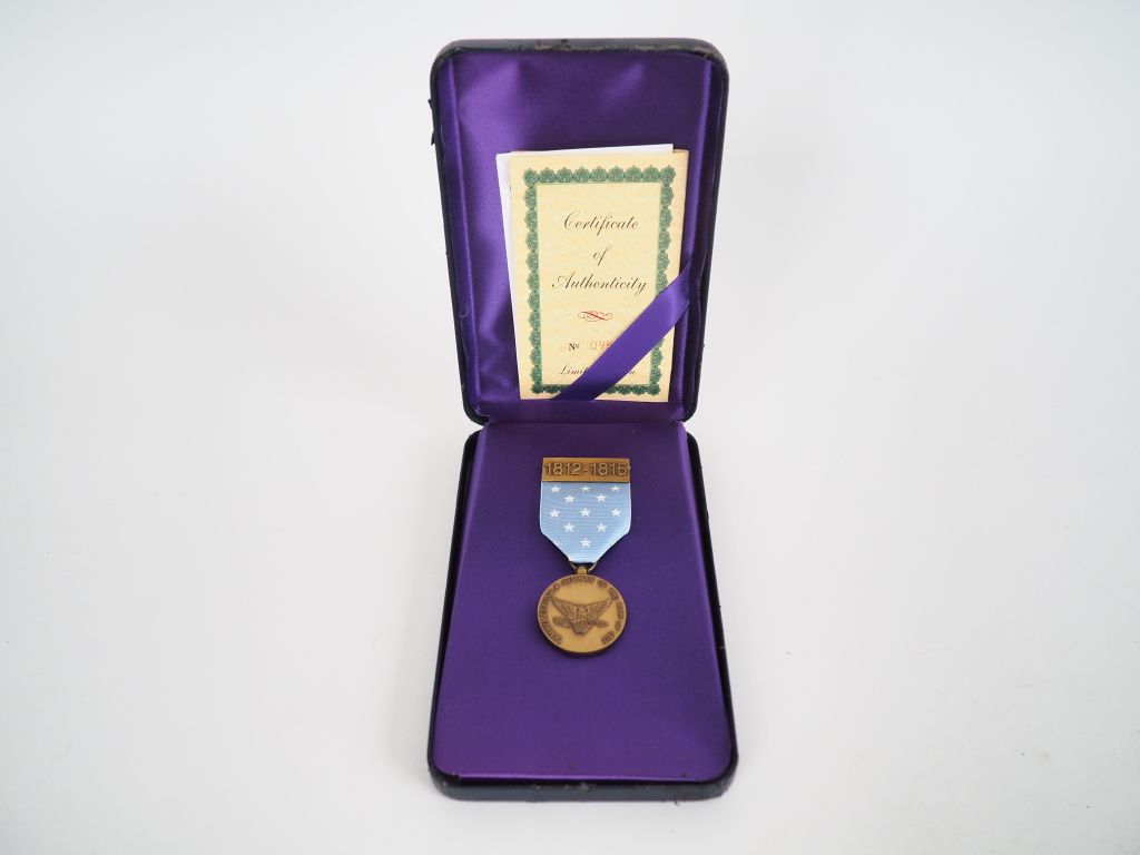 boite en plastique rigide bleu sur fond de rayonne violette contenant un médaille commémorative U.S. célébrant les vétérans de la guerre 1812/1815. (Fabrication moderne). (Etat 1+)
