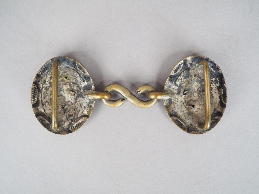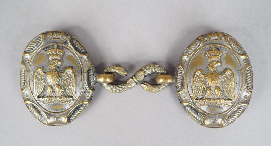 Boucle agrafe de ceinturon porte épée d’officier supérieur Second Empire. Deux boucles ovales bombées en laiton aigle couronnée sénestrogyre sur foudre crochet serpentiforme. Etat 1