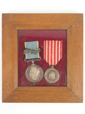 Cadre contenant deux décorations relatives à un ancien combattant du second empire contenant une médaille Anglaise dite de Crimée attribuée à un Français. Avers profil de la reine Victoria couronnée avec la légende "VICTORIA REGINA 1854". Sur le revers allégorie de la victoire couronnant un guerrier et le mot "CRIMEA".Ruban bleu à fines rayures jaunes, barrettes argent "SEBASTOPOL" tranche du module attribué "Causse" et une médaille commémorative de la campagne d’Italie de 1859, module en argent signée Barre, les deux avec leur ruban.1