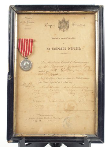 Cadre contenant la médaille commémorative de l’expédition d'Italie (1859), attribuée aux 120 000 hommes du corps expéditionnaire, module argent signé « Barre » tête de l'empereur à l'avers, revers portant sur le pourtour "CAMPAGNE D'Italie 1859" et le nom des batailles "MONTEBELLO-PALESTRO-TURBIGO-MAGENTA-MARIGNAN-SOLFERINO", ruban rouge à fines rayures blanches, avec son diplôme d’attribution au caporal « Walton » 1.