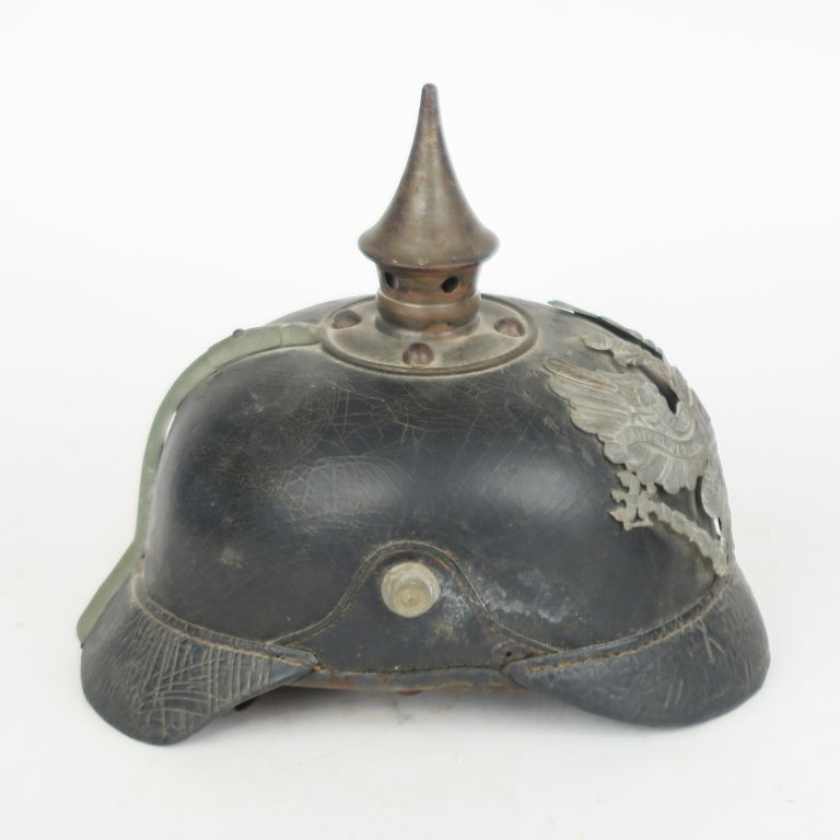 Casque à pointe modèle 1915. Bombe en cuir. Pointe, plaque et tourillons en fer peint en gris. Intérieur de bombe BA XIV Coiffe en cuir. Manque les cocardes et la jugulaire. A.B.E.