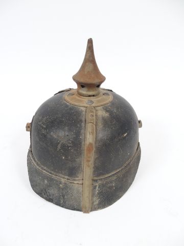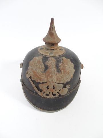 Casque à pointe prussien troupe modèle 1915 toutes garnitures en acier gris, complet sauf jugulaire et cocardes. Pointe démontable, dents de loup bien claires et intactes, marquage frappé dans la nuquière « BJA XVIII » (Atelier d’habillement du XVIII corps d’armée). Casque jamais démonté juste à nettoyer. 2.