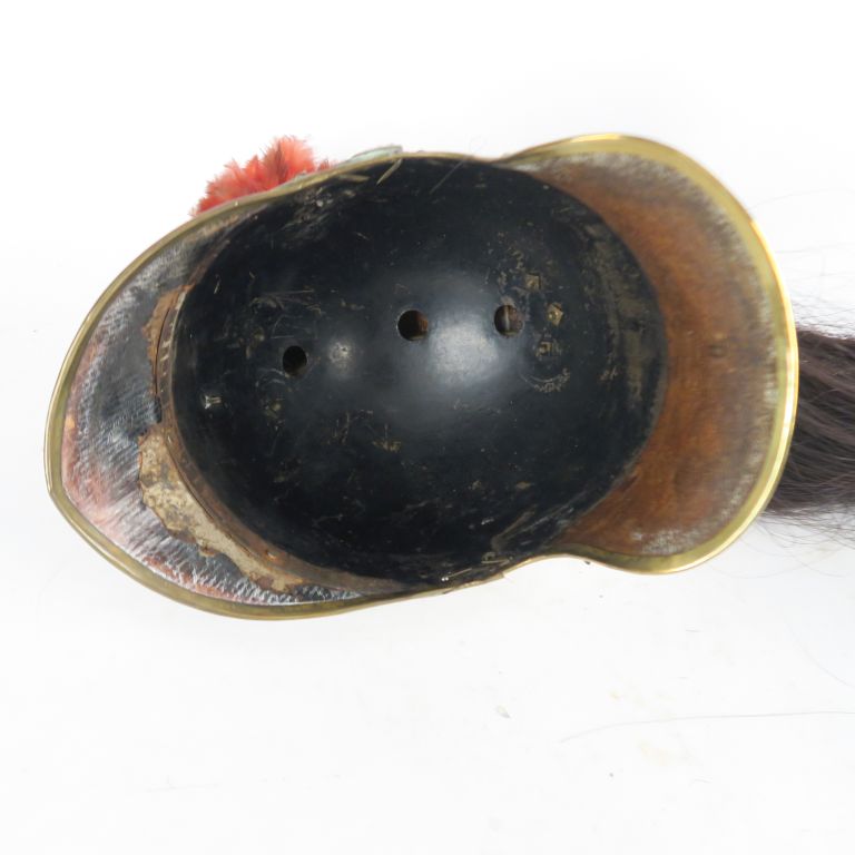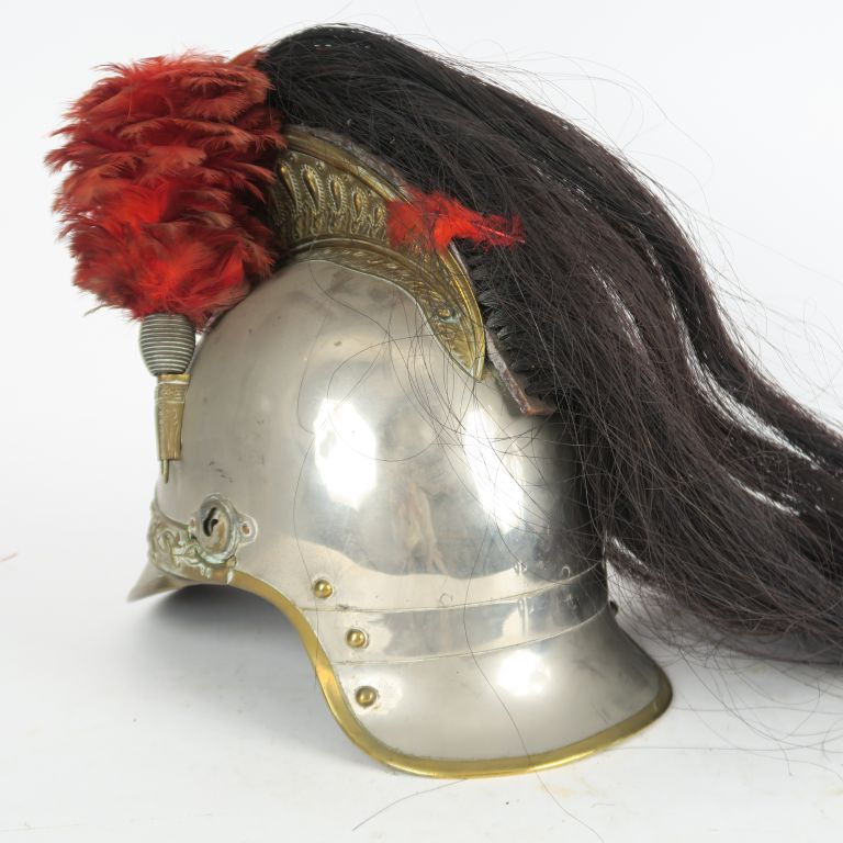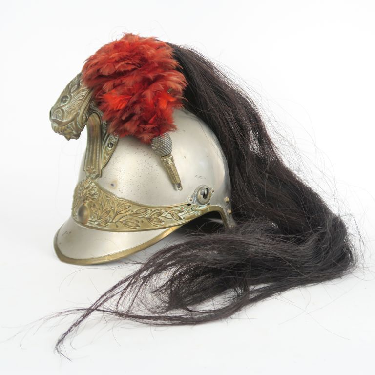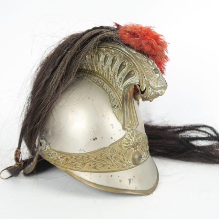 Casque de dragon modèle 1872. Bombe nickelée poinçonnée d’Alexis Godillot. Marmouset, Cimier à godrons, bandeau à la grenade et jonc en laiton. Longue crinière et tresse en crin. Plumet écarlate à olive métallique argentée. E.M. (Manque les jugulaires et la coiffe).