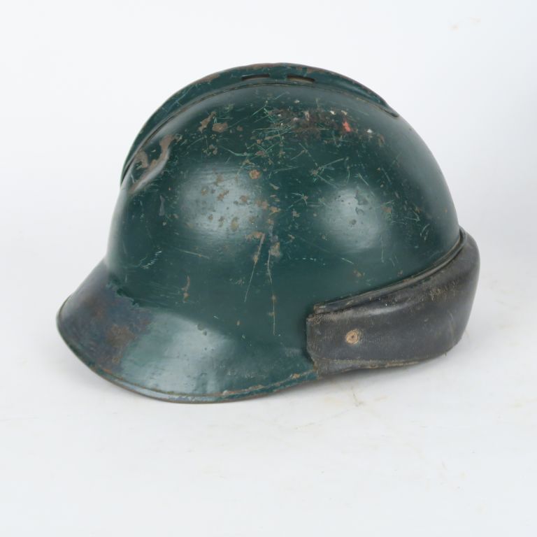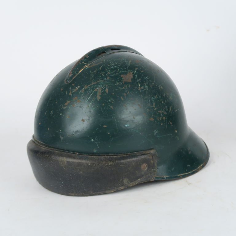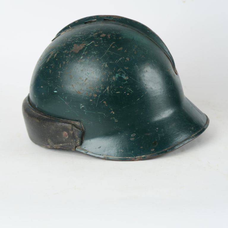 Casque modèle 1945. Repeint en vert (éclats). Bandeau en cuir. Coiffe intérieure en cuir et toile. Manque la jugulaire. A.B.E. (Coups).