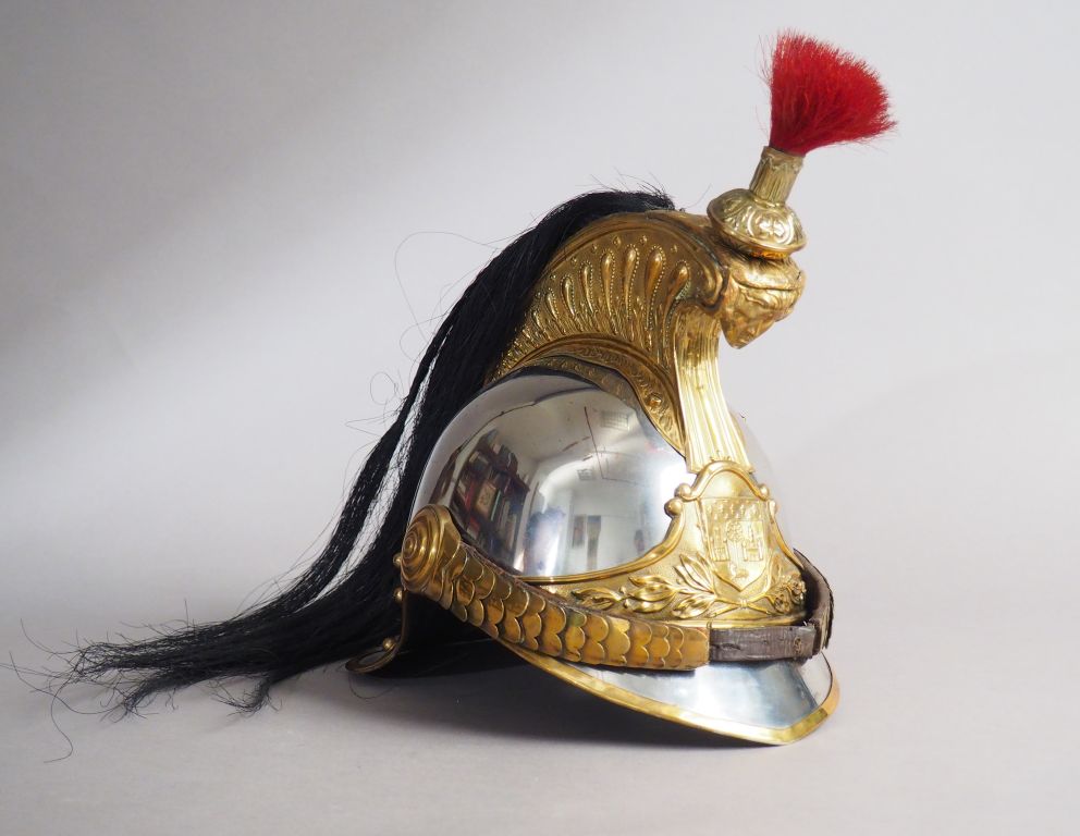 Casque troupe de cuirassier modèle 1874, bombe en acier poli, toutes garnitures en laiton, cimier à la face avant ornée de la tête de méduse, porte plumet, marmouset à houppette de crin rouge, jugulaire à écailles, rosace de jugulaire à quatre joncs en relief, la plaque formant bandeau frontal porte les armoiries de la ville de Toulouse (de gueules à la croix cléchée et pommetée d'or, sur une hampe du même posée en pal, accompagné à dextre d'un château donjonné de trois tours et à senestre d'une basilique de trois clochers, le tout d'argent maçonné de sable, à l'agneau pascal aussi d'argent, la tête nimbée et contournée, en pointe , au chef d'azur semé de fleurs de lys d'or) en son centre encadrées de guirlande de feuilles de laurier. Casque complet avec son intérieur cuir à dent de loup.