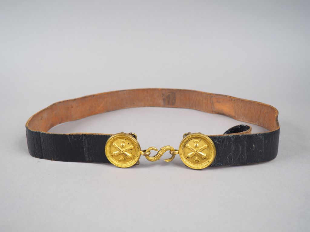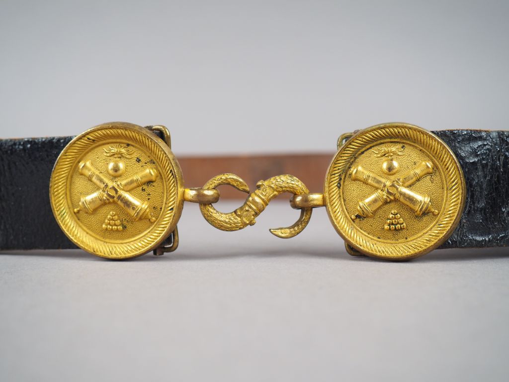 Ceinturon d’artillerie Troisième République, deux plateaux ronds en bronze doré, allégorie de l’artillerie avec deux canons croisés sur une pyramide de boulets, le tout surmonté d’une bombe flammée. Crochet serpentiforme, cuir brut, verso laqué noir brillant (coltar). Etat 1