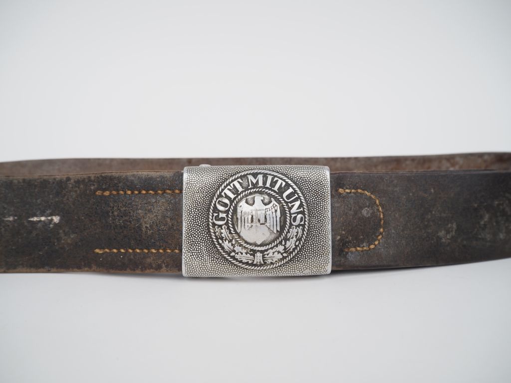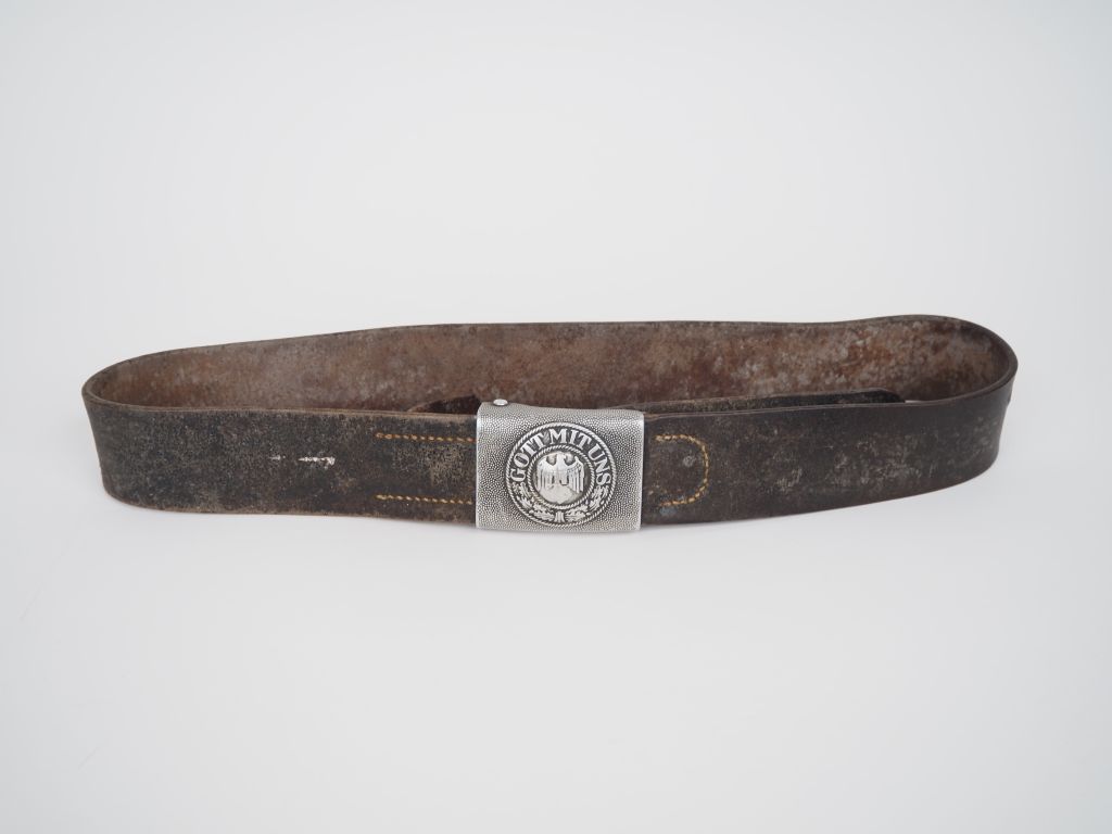 Ceinturon de soldat de l’armée de terre allemande (2e guerre mondiale). En cuir à boucle en aluminium. A.B.E. (Dénazifié, par suppression de la croix et gravure artisanale d’une croix de Lorraine)