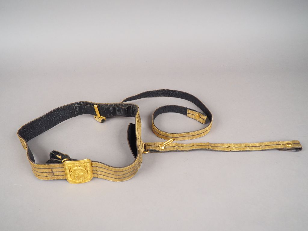Ceinturon d’Officier de grande tenue en cuir noir habillé de passementerie de canetille dorée à trois filets noir, avec ses attaches porte sabre. Boucle d’officier modèle 1845 rectangulaire en laiton doré à pans coupés, République en pied et devise sur bandeau encadrant « HONNEUR ET PATRIE ». Etat 1