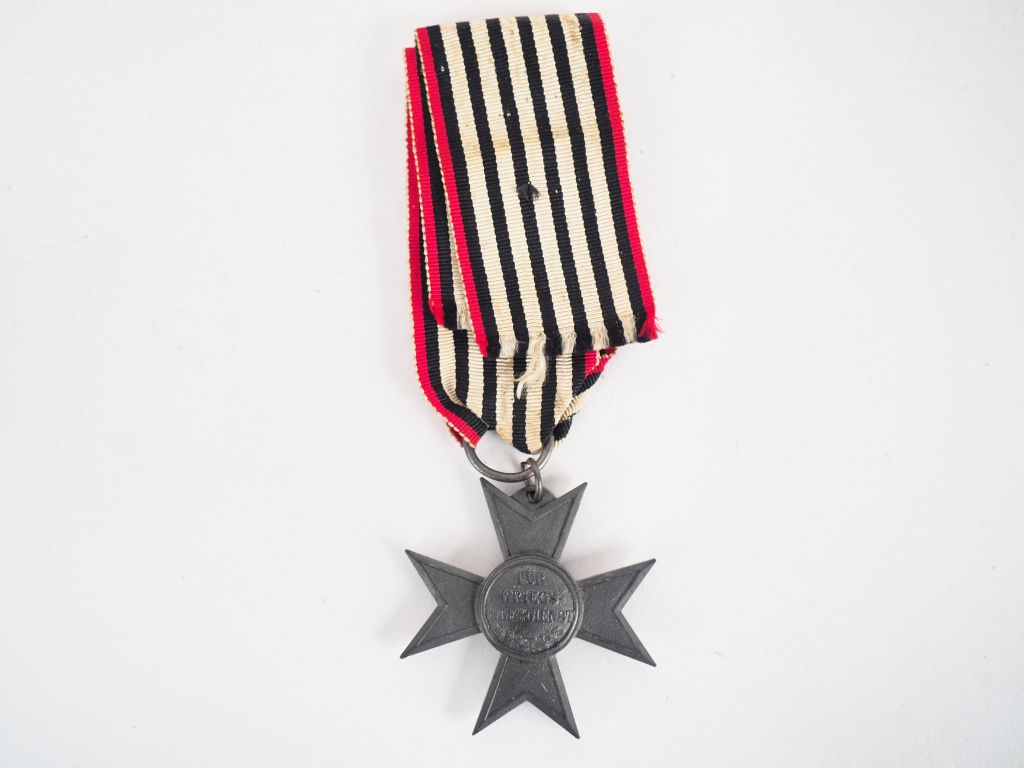 Croix allemande des services auxiliaires époque Allemagne impériale. Croix biface en kriegsmetall gris, avec son ruban blanc à raies moires et bordure rouge. 1ére guerre mondiale. (Etat 1)