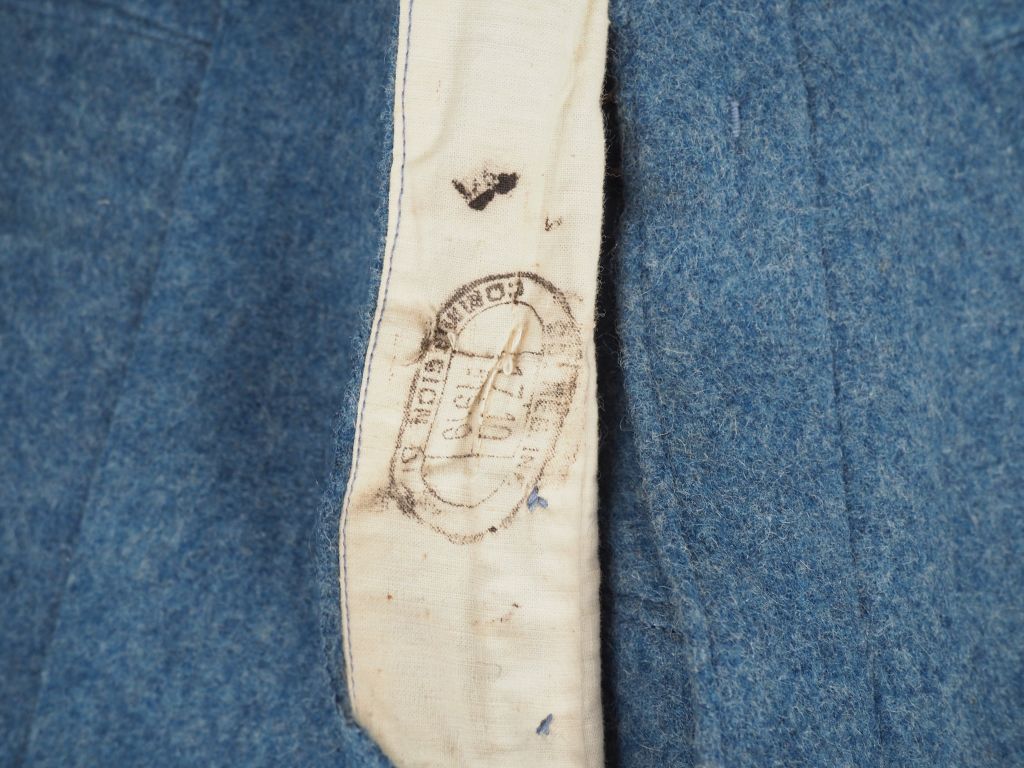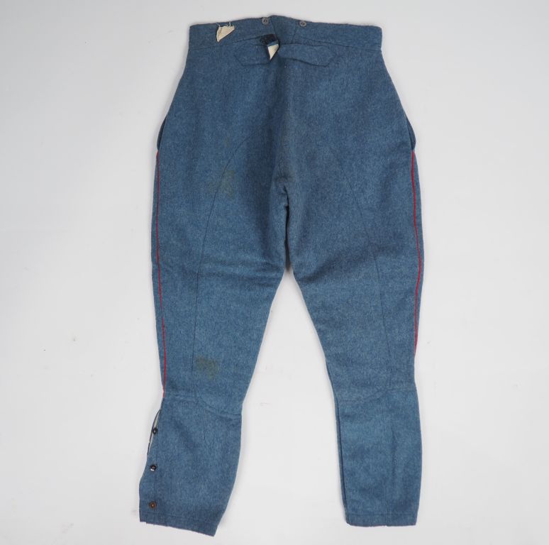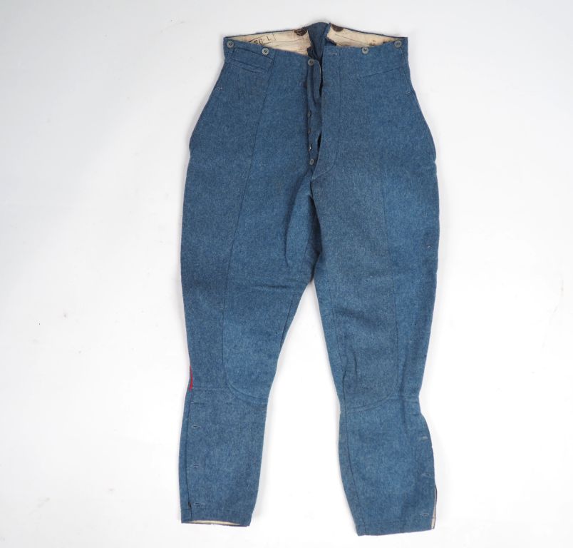 Culotte d’artillerie en drap bleu horizon, à passepoil écarlate. Cachet de réception 1919. Boutons « équipements militaires. » Cachet Bourse du travail Béziers. B.E.